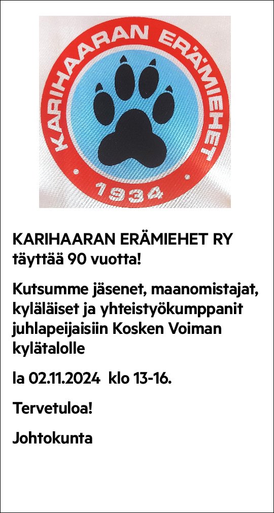 Karihaaran Erämiehet ry. kutsuu maanomistajat,kyläläiset ja jäsenet hirvipeijaisiin Koskenvoiman talolle lauantaina 08.11.2025 klo 13-15. Tervetuloa!
